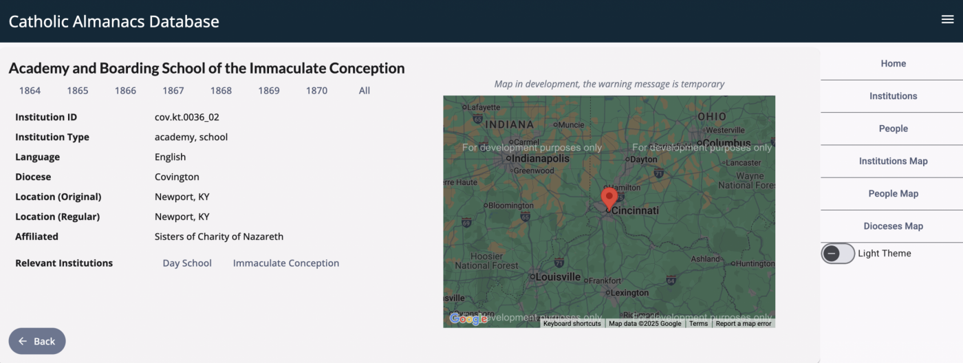 Yuchen Xiong, currently in her second year of the English MA program, has been working on developing the database to house the Catholic almanac data, which she began in Spring 2025 as part of her capstone project. On the backend, she has improved the table structure to enable complicated queries for religious orders, interrelated institutions in a specific diocese, visiting pastors across various institutions, and more. On the frontend, she designed multiple filter fields and embedded interactive maps that will enable users to view the location of individual institutions and people, as well as search for all institutions, people, and dioceses across the years. |