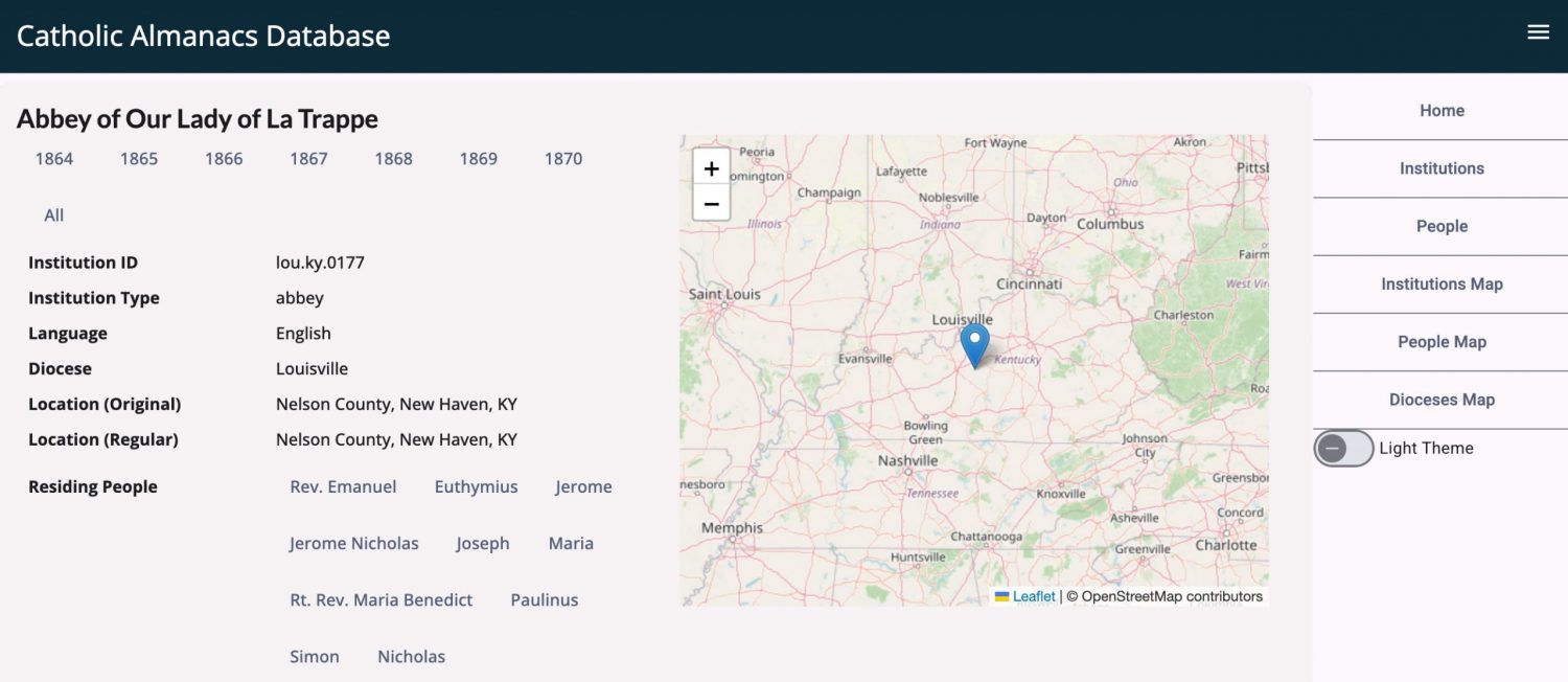 The beta version of the Catholic Almanacs database, built by Yuchen Xiong. |