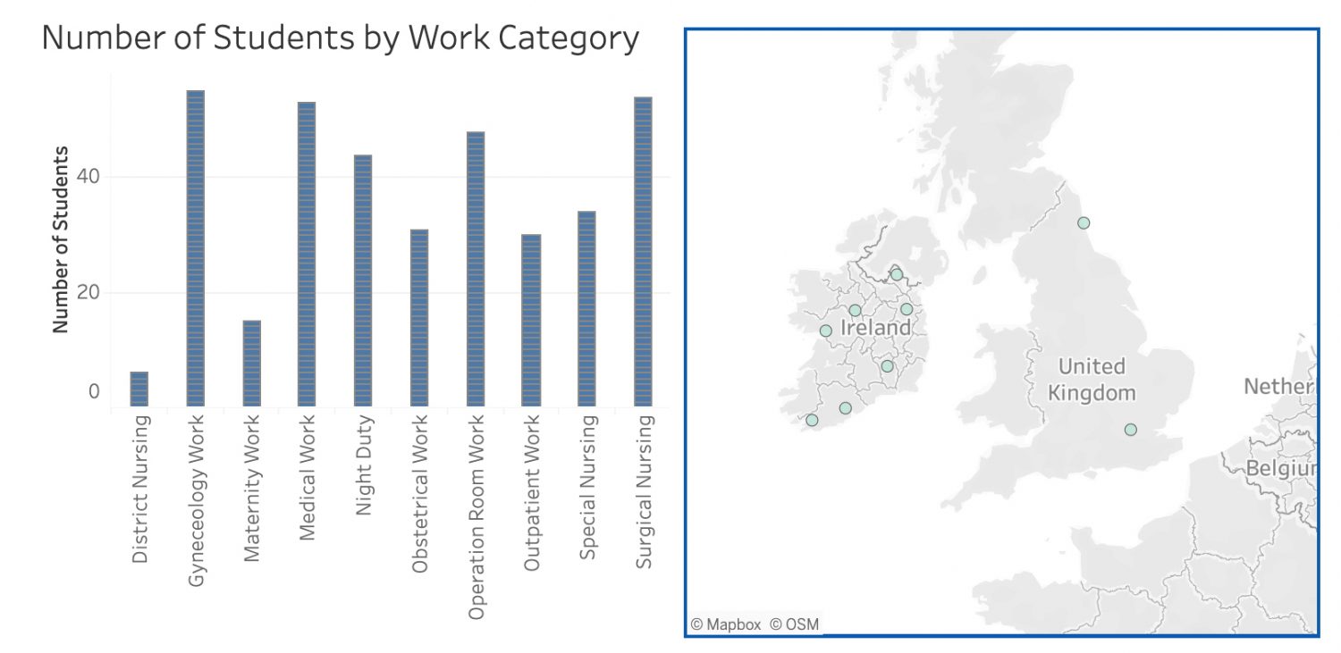 Two of Faris's visualizations of data from the nursing ledgers, showing the specialities of nursing students and the place of origin of some immigrant students. |